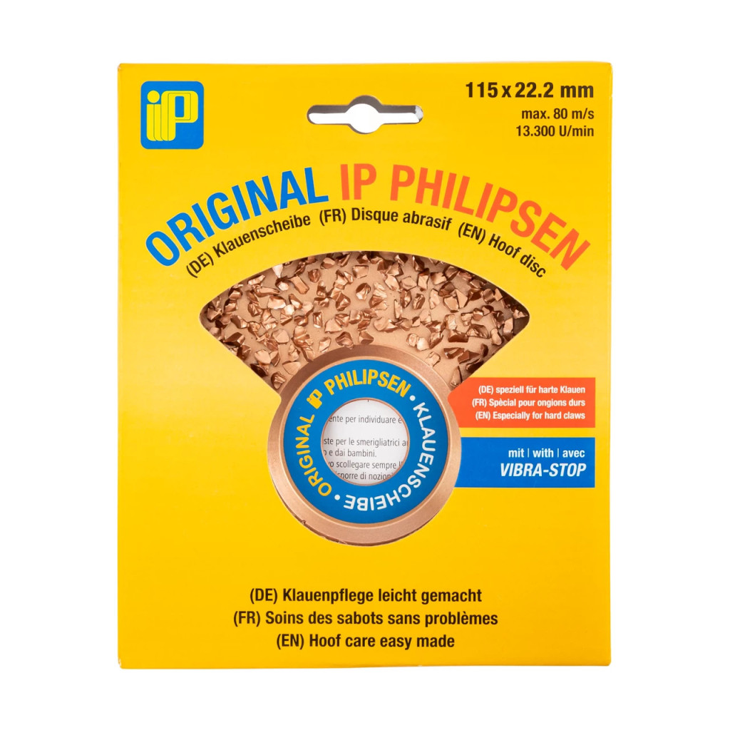Абразивният диск IP Philipsen с диаметър 115 мм е вашият надежден помощник в ежедневната грижа за копитата на едрия рогат добитък. Създаден специално за тази цел, той ви позволява бързо, ефективно и безопасно да поддържате правилното състояние на животните.