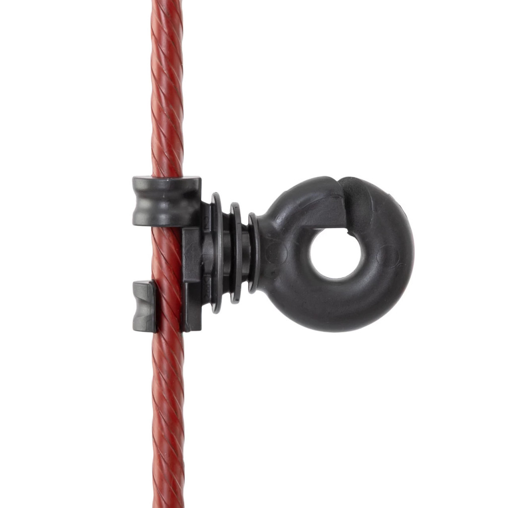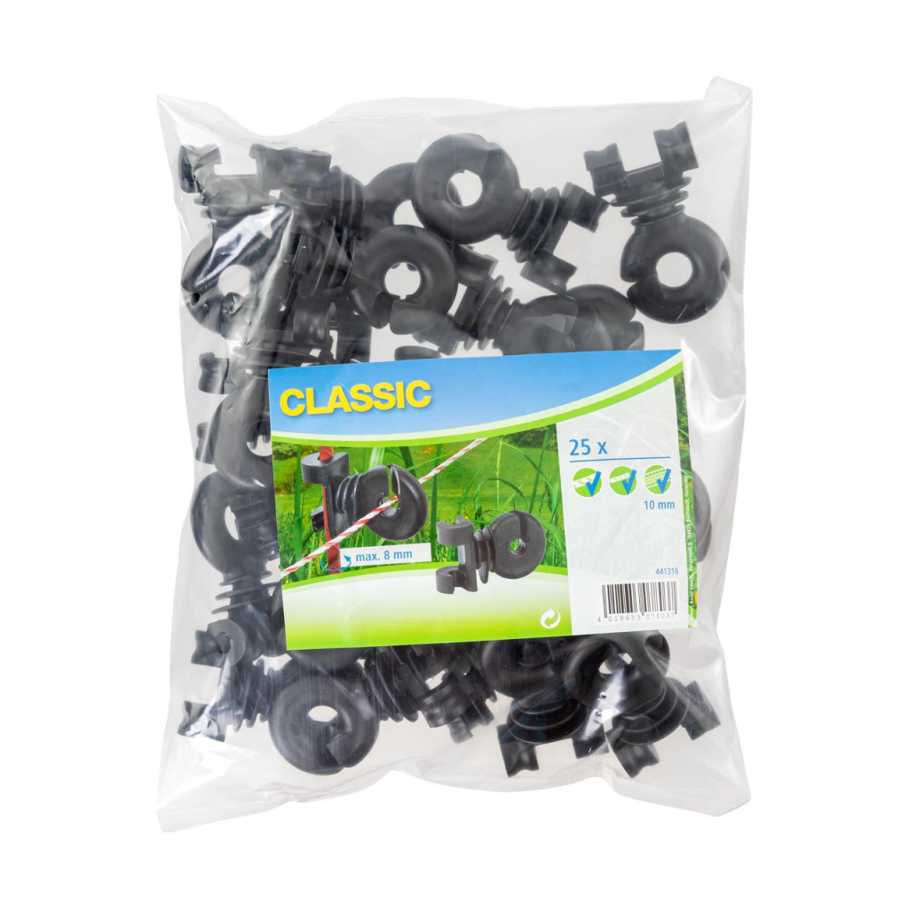 Лесно монтиране без инструменти, стабилно захващане без плъзгане, възможност за добавяне на допълнителни нива на оградата, устойчивост на атмосферни влияния. Опаковката съдържа 25 броя изолатори.