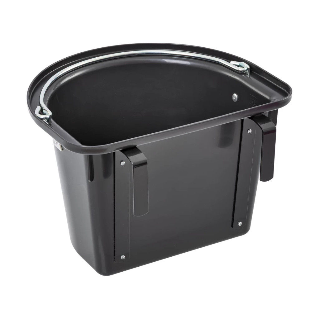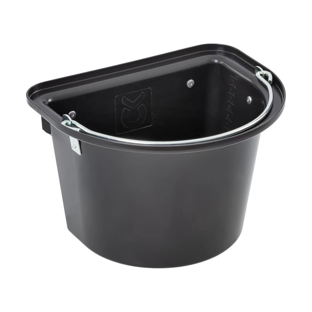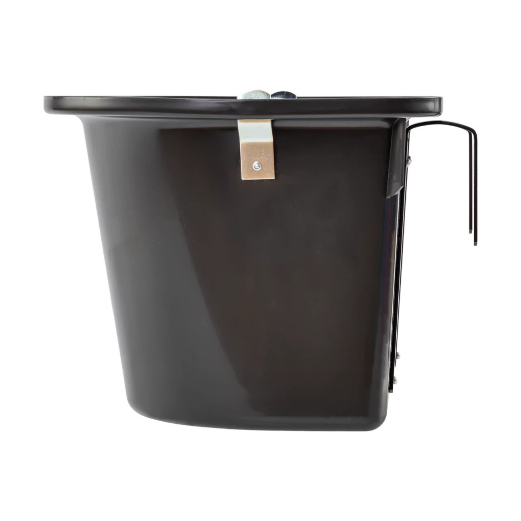 Сигурно окачване: Интегрираната метална конзола (скоба) ви позволява да закрепите кофата бързо и стабилно към стената на бокс, коридор или вътрешността на ремарке. Това предотвратява преобръщане и разплискване на съдържанието, осигурявайки спокойно хранене на коня.