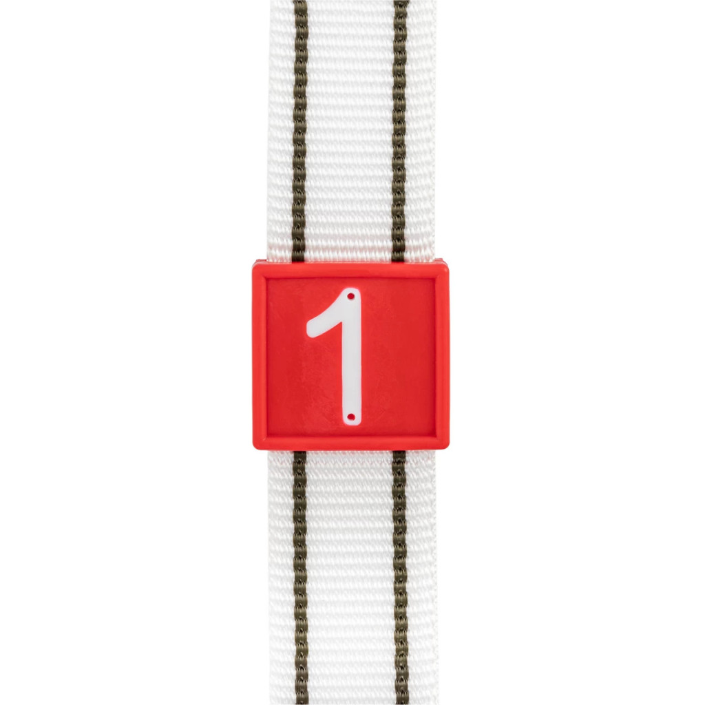 Лесно монтиране и стабилност: Цифрите са проектирани за стандартни синтетични ленти (колани) с ширина 40 мм. Комплектът включва и специален еластичен елемент, който фиксира блока на място и предотвратява нежеланото му плъзгане или въртене по лентата, осигурявайки постоянна правилна ориентация на номера.