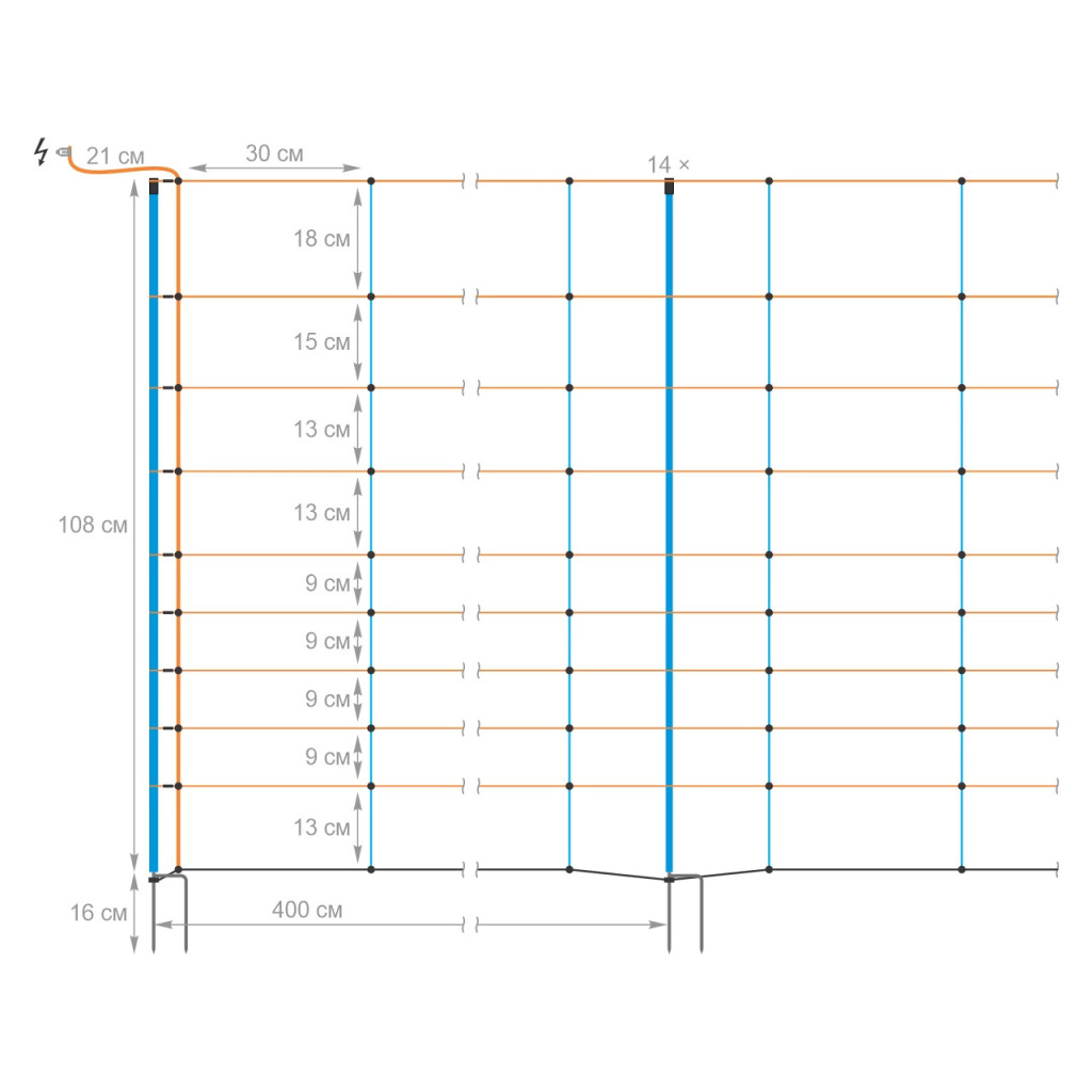 За да функционира системата, е необходим отделно закупен импулсен генератор (електропастир). Моля, обърнете внимание, че поради размера на долните отвори (30 × 13 см), тази мрежа не е подходяща за задържане на кокошки, птици или други много дребни животни, които биха могли да минат през тях.