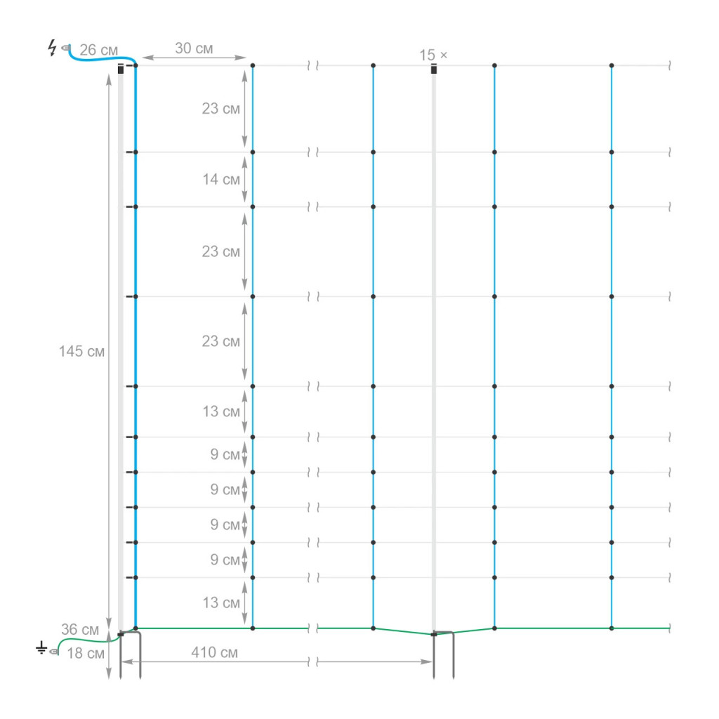 Важно: За да функционира, мрежата трябва да бъде свързана към импулсен генератор за електропастир, който се избира според дължината на оградата и вида на животните. Можете да изберете подходящ генератор от нашата гама енергизатори.