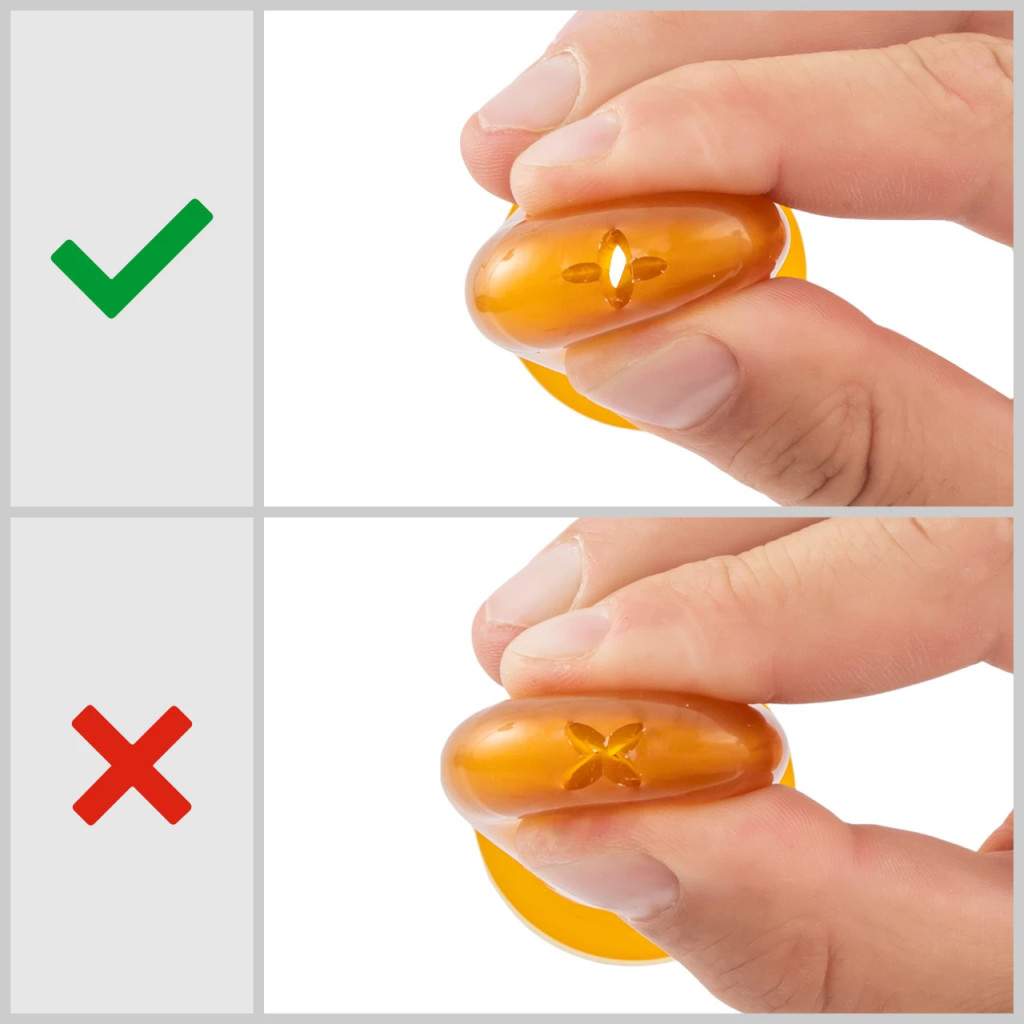 За да работи биберонът оптимално, е важно да се монтира правилно. Когато го поставяте в отвора на кофата или бутилката, се уверете, че кръстообразният отвор е ориентиран вертикално и хоризонтално спрямо вас (като „+“), а не под ъгъл (като „x“). Неправилното поставяне може да ограничи потока на млякото, което ще удължи времето за хранене и ще увеличи износването на гумата.