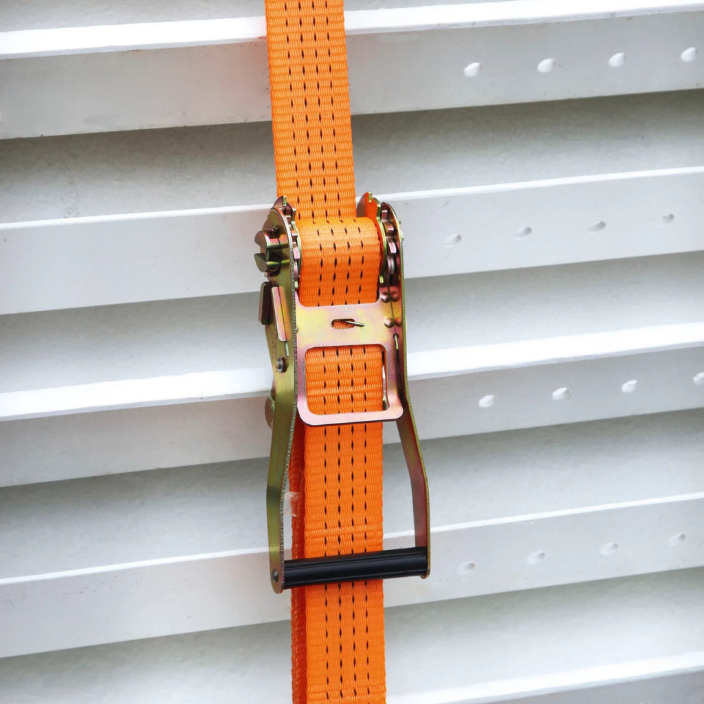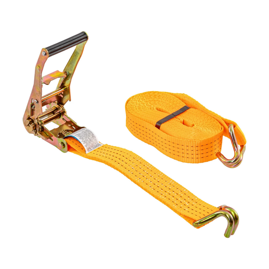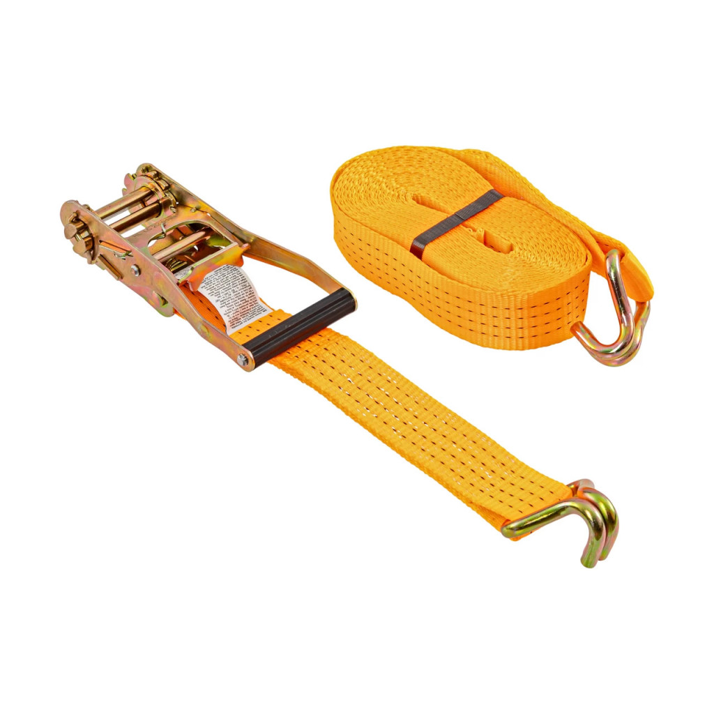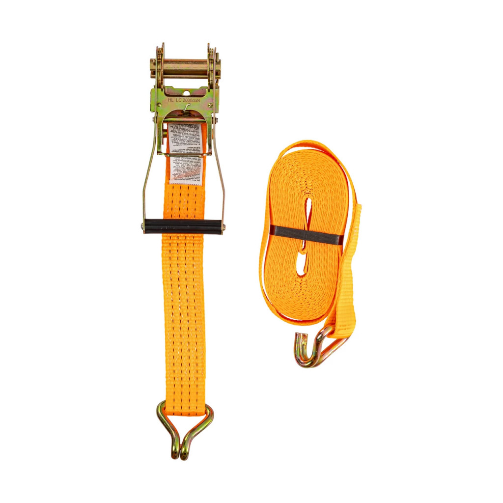 Коланът е изработен от полиестерен текстил, обработен чрез импрегниране с PU за по-добра защита срещу UV лъчи и износване. Системата със зъбчата предавка (тресчотка) позволява контролирано натягане на лентата и осигурява здраво и сигурно закрепване на товара. Двойните J-образни куки улесняват бързото захващане на точките за закрепване на превозното средство или платформата.