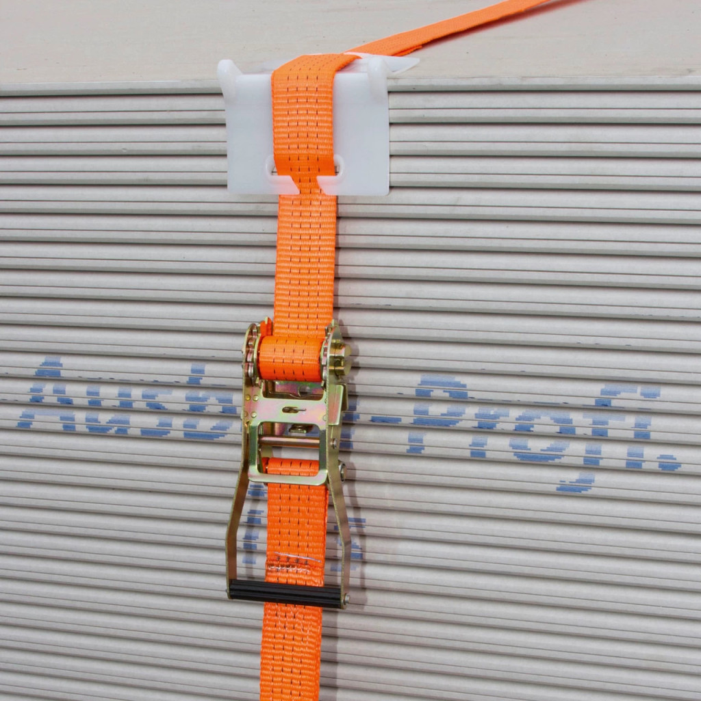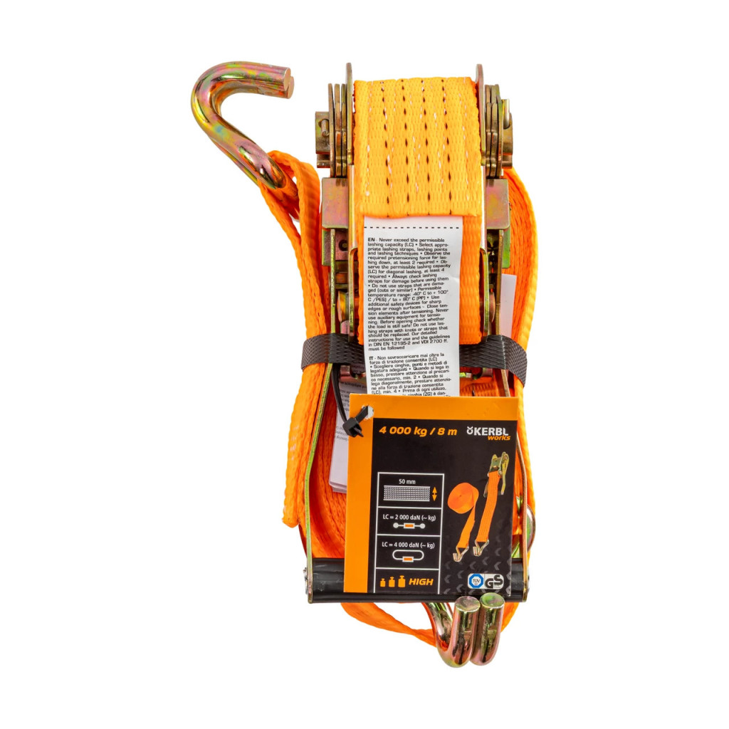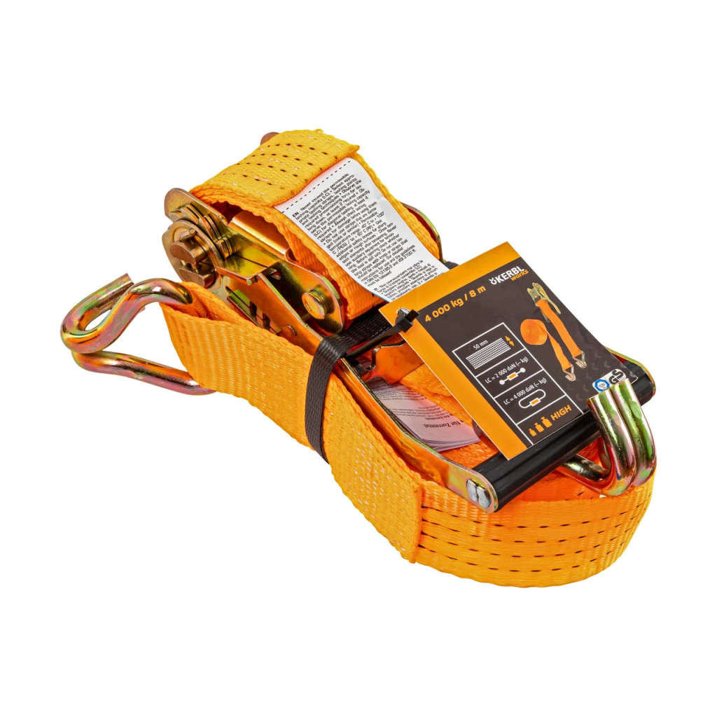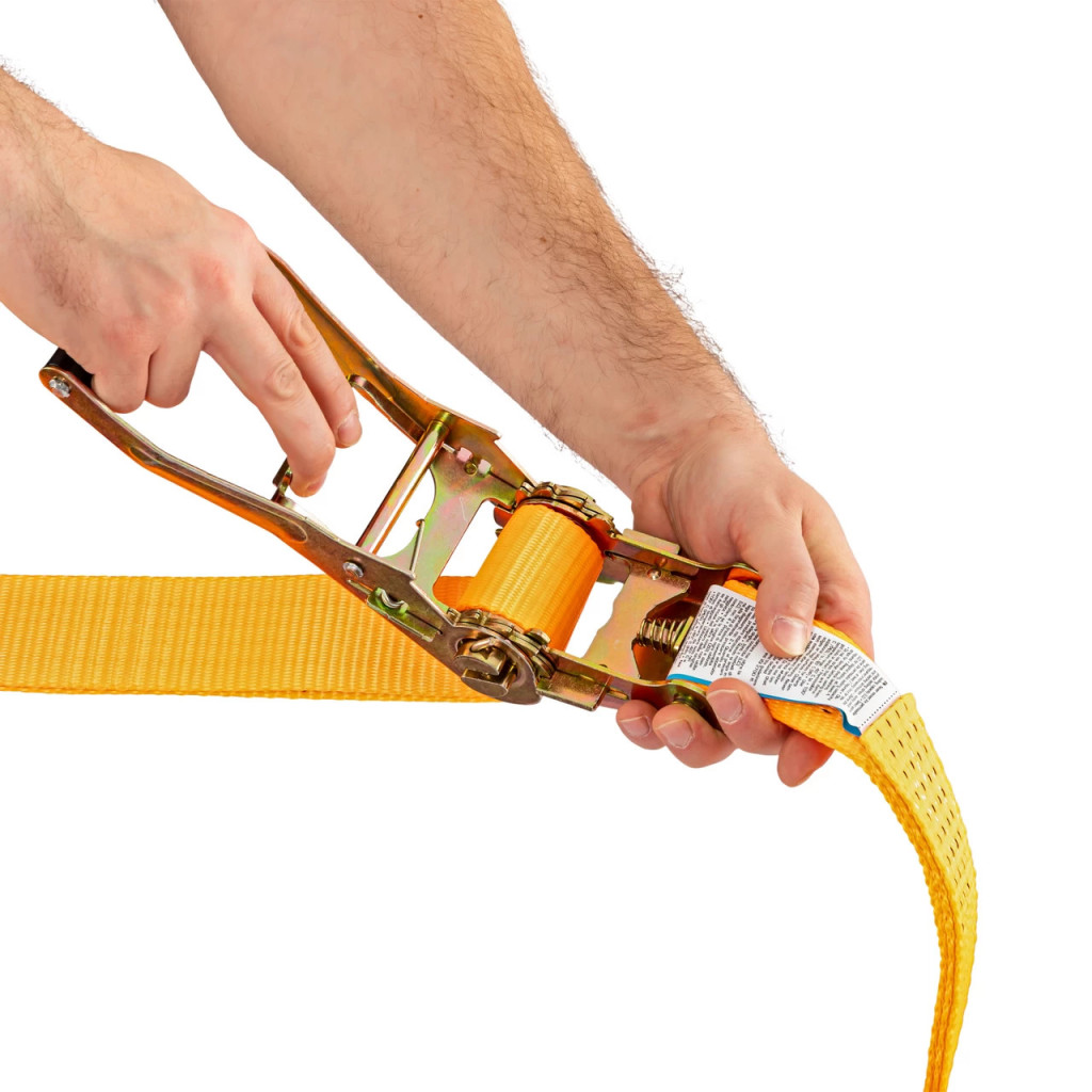 Коланът е изработен от полиестерен текстил, обработен чрез импрегниране с PU за по-добра защита срещу UV лъчи и износване. Системата със зъбчата предавка (тресчотка) позволява контролирано натягане на лентата и осигурява здраво и сигурно закрепване на товара. Двойните J-образни куки улесняват бързото захващане на точките за закрепване на превозното средство или платформата.